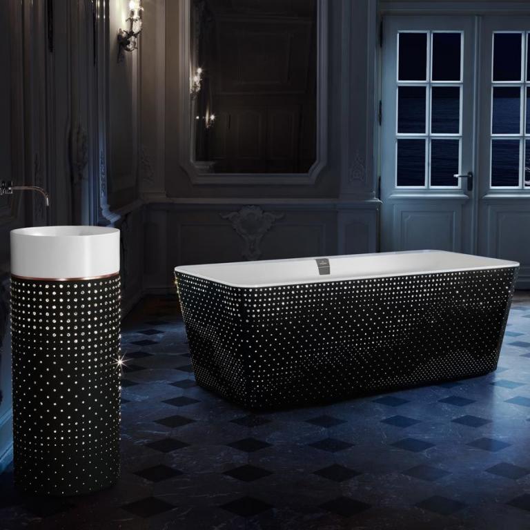 Ausgewählt hat Leung dafür Swarovski Xirius Rose Kristalle in den drei Größen 5 mm, 10 mm und 15 mm, die aufgrund ihres besonderen Schliffs unvergleichlich brillant glitzern und in Handarbeit auf das Leder aufgebracht wurden. Der funkelnde Glanz der Kristalle verleiht Säulenwaschtisch und freistehender Badewanne eine glamouröse Luxus-Attitüde, die ihresgleichen sucht.