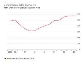 Trotz nach wie vor hohem Bedarf und der hohen Zahl von Baugenehmigungen wurden in Deutschland 2018 nur unwesentlich mehr Wohnungen fertig gestellt als 2017. Nach Berechnungen des Statistischen Bundesamtes (Destatis) wurden 285 900 Wohnungen fertig gestellt, 0,4 Prozent oder 1 100 mehr als im Vorjahr. Ohne Berücksichtigung der Wohnungen in Wohnheimen stieg die Zahl der Baufertigstellungen um 2,6 Prozent. Die im Jahr 2011 begonnene positive Entwicklung habe sich danach zwar fortgesetzt, konnte aber nicht den nach wie hohen Überhang von genehmigten, noch nicht fertig gestellten Wohnungen nachhaltig abbauen. Eine höhere Zahl an fertig gestellten Wohnungen hatte es zuletzt im Jahr 2002 gegeben (289 600).