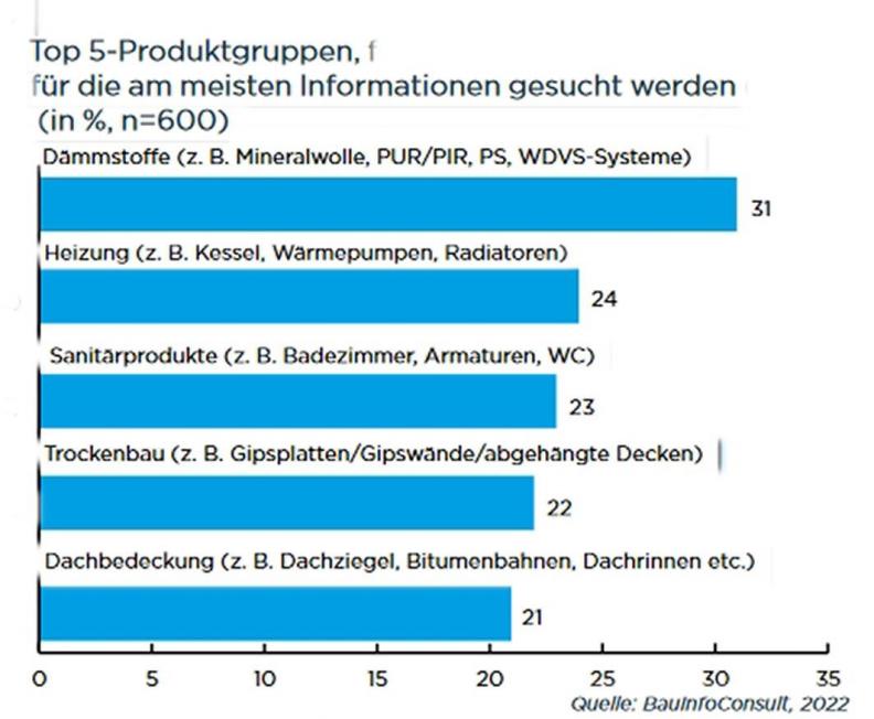 In telefonischen Interviews wurden Mitarbeitende in Maler-, Trockenbau- und SHK-Handwerksbetriebe zu ihren Informationsvorlieben und -gewohnheiten befragt. Die „Top 5“ der Produkte, über die vor allem nach Informationen gesucht werden, wird wenig überraschend von Themen dominiert, die mit den zentralen Anforderungen an das Bauen im Gebäudeenergiegesetz (GEG) zu tun haben, sprich Produkte, die das darin zentrale Thema Energieeffizienz betreffen wie Dämmstoffe oder Heiztechnik. Dabei ist der Komplex Dämmung bei fast allen betrachteten Bauzielgruppen von großer Relevanz, mit der naheliegenden Ausnahme des SHK-Handwerks, das dagegen zusammen mit einigen Architektinnen und Architekten vornehmlich am Thema Heizung interessiert ist.
