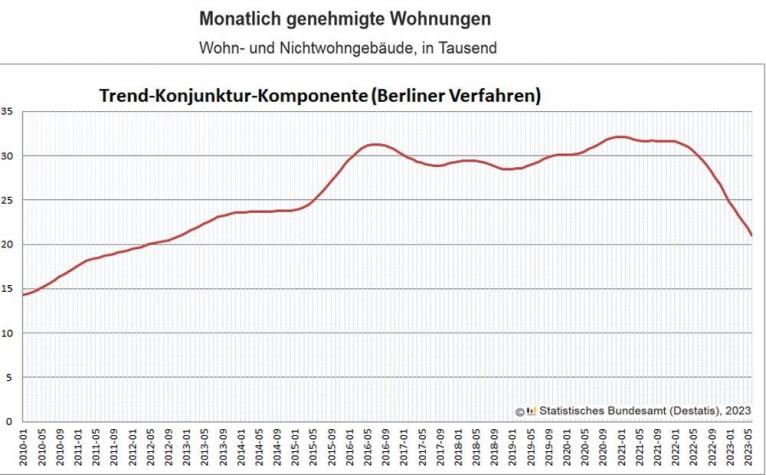 Zeitraum März bis Juni 2023 ging danach im Vergleich zum Vorjahreszeitraum sogar etwas stärker zurück (Einfamilienhäuser ‑38,6 Prozent, Zweifamilienhäuser ‑53,9 Prozent und Mehrfamilienhäuser ‑28,7 Prozent als im gesamten 1. Halbjahr 2023). Verglichen mit dem 1. Halbjahr 2022 wurden in diesem Zeitraum 27,2 Prozent weniger Baugenehmigungen erteilt. Im Vergleich Juni 2022 und Juni 2023 waren es sogar 28,5 Prozent weniger Genehmigungen.