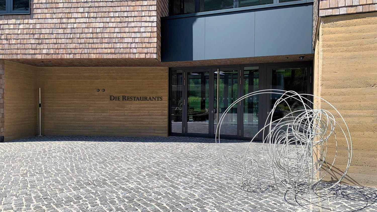 Der neue Dreigiebelbau präsentiert sich moderner und lichter als sein Vorgängerbau, ohne auf den regionalen Bezug ganz zu verzichten. Dafür sorgen beispielsweise graue, vorpatinierte Schindeln aus heimischen Hölzern als schwarzwaldtypische Verkleidung der Fassade. Im Inneren erwartet die Gäste künftig auf über 420 Quadratmetern wieder die kulinarische Vielfalt des Hotels mit drei Restaurants.