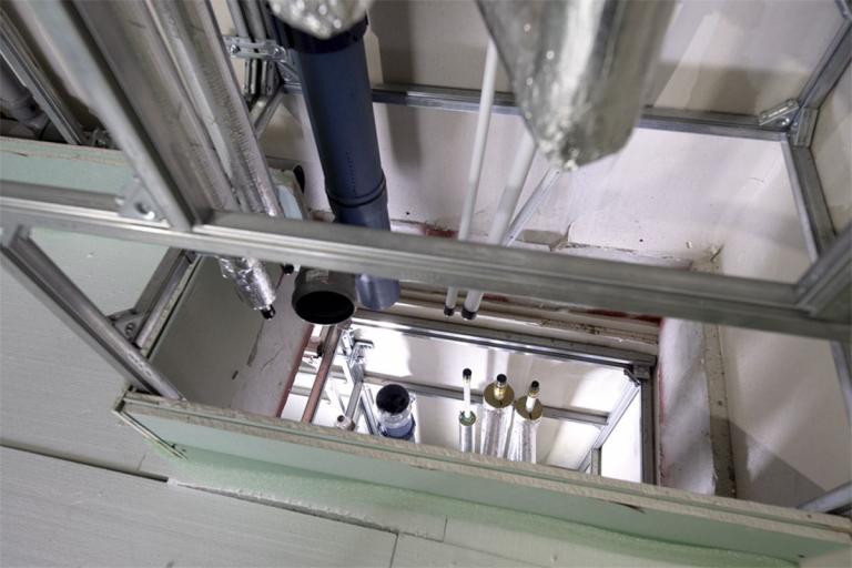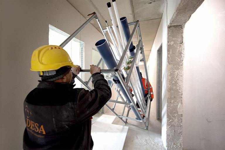 Die Installationswände und -schächte werden zum gewünschten Zeitpunkt angeliefert, ausgerichtet und am Baukörper fixiert. Abschließend werden die Rohrleitungen miteinander verbunden. Der beispielhafte Einbau einer vorgefertigten Installationswand konnte in noch nicht einmal zwei Stunden erfolgen.