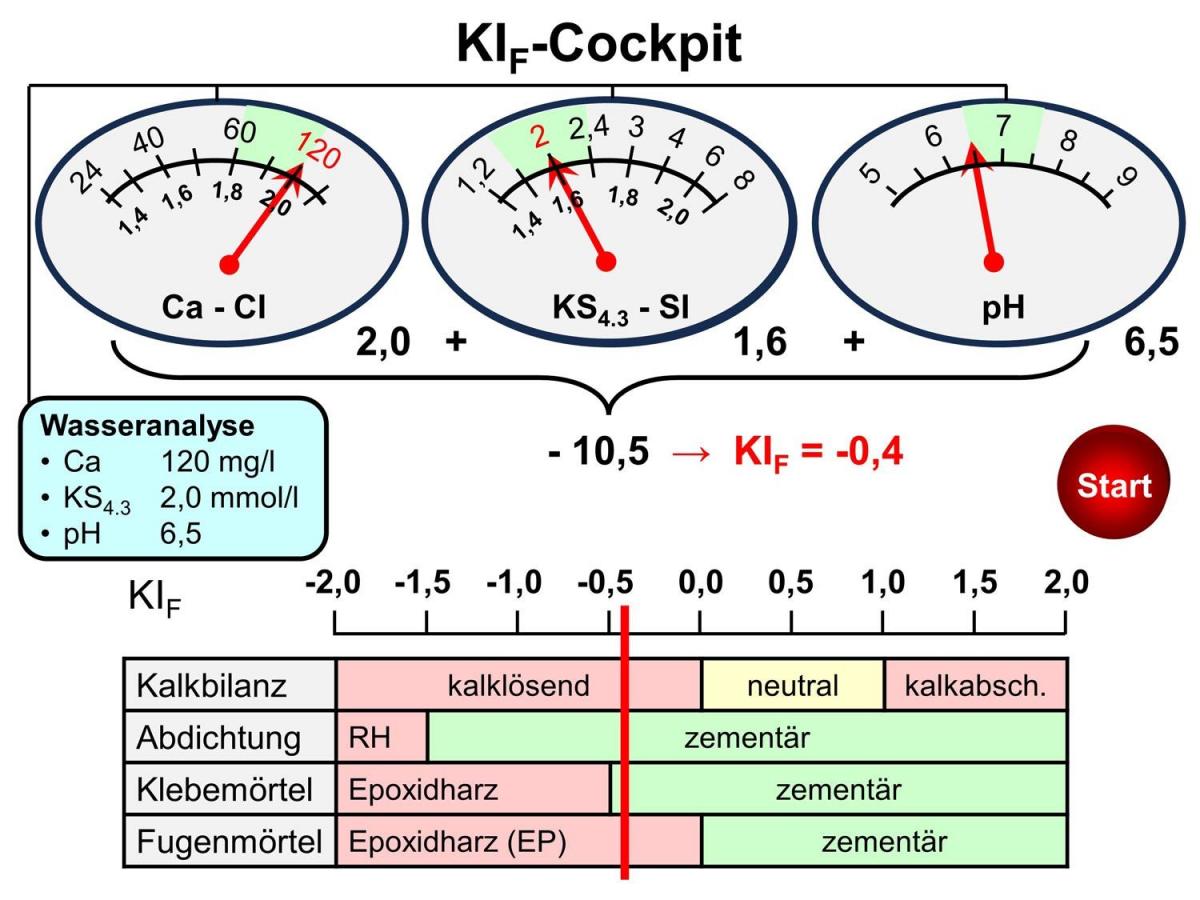 Eine einfache Methode, die mit Hilfe des pH-Werts, der Wasserhärte und der Säurekapazität die Bewertung des Kalklösevermögens von Beckenwässern ermöglicht, ist der so genannte Kalkindex (KIF). Prof. Dr. Josef Felixberger, Technischer Direktor bei PCI Augsburg GmbH, beschreibt die damit mögliche einfache Methode dieser Entscheidungshilfe. Je nach Wert des Kalkindexes erlaubt ein das „KIF-Cockpit“ eine schnelle Entscheidung darüber, ob Fugenmörtel, Verlegemörtel und Flüssigabdichtung auf Zement- oder Reaktionsharzbasis (RH) zu verarbeiten sind.