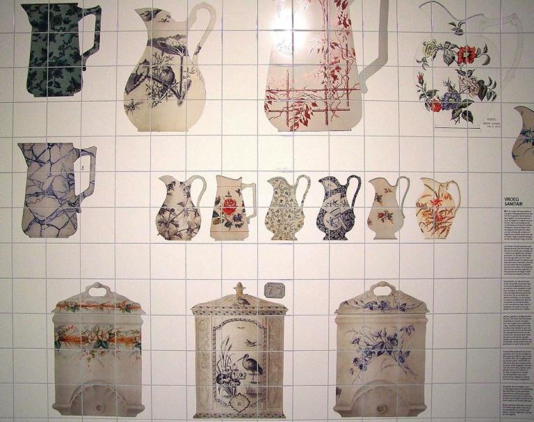 Das niederländische Unternehmen MaatWerkTegels brannte die insgesamt 30 000 Fliesen in den Maßen 15 x 15 Zentimeter. Hier können jetzt verschiedene keramische Techniken wie Kupferstich, Transfer, Handmalerei und Entwurfszeichnungen bewundert werden. Des Weiteren wurden Fotos von Arbeitsumfeld, Gebäuden, Sanitärproduktion, alten und neuen Öfen und vielen Keramikprodukten auf Fliesen gebrannt.