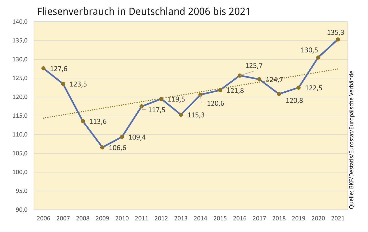 Keramische Fliesen in Deutschland zu verkaufen, ist nichts für schwache Nerven. Die statistische Kurve des Fliesenverbrauchs auf deutschen Baustellen in den letzten 15 Jahren gleicht einer Berg- und Talfahrt. 12 Jahre, nachdem die Branche in den Abgrund blickte, sind die die düsteren Zeiten zwar nicht vergessen, aber immerhin überwunden. Dabei war der Aufstieg von 106,6 Millionen Quadratmetern (2009) zu den aktuell für das Jahr 2021 gemeldeten 135,3 Millionen Quadratmetern Fliesenverbrauch in Deutschland alles andere als geradlinig.