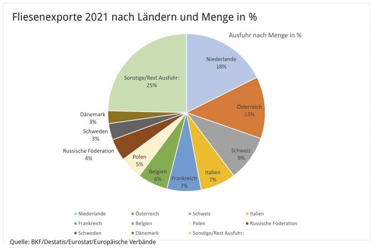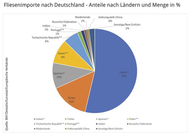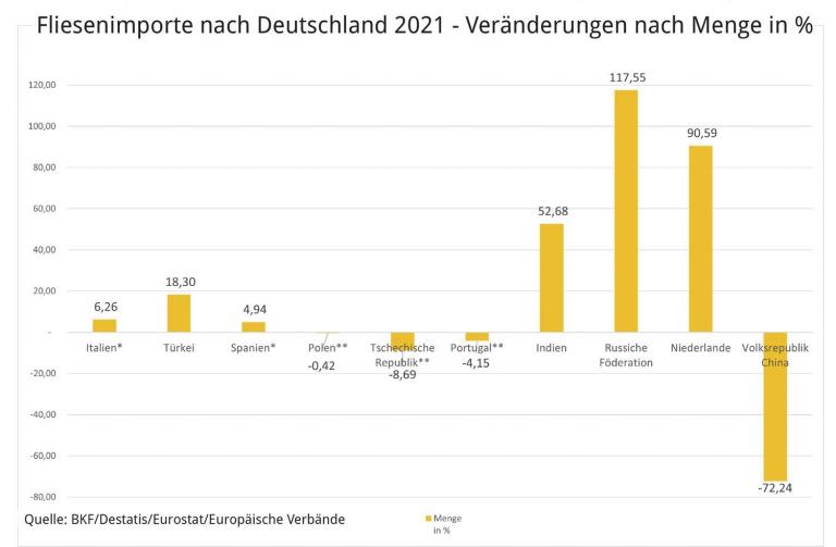 Insgesamt war der Fliesenabsatz in Deutschland für die Fliesenhersteller zufriedenstellend. Der Verbrauch 2021 beträgt nach vorläufigen Zahlen 135,3 Mio. m². Dies entspricht einem Plus von 3,6 Prozent. Die Produktion ist leicht, um 0,8 Prozent, gestiegen, die Importe um 4,9 Prozent und die Exporte um 4,6 Prozent. Die Umsätze sind um 6,3 Prozent gestiegen, was zum Teil auf die Kostensteigerungen zurückzuführen sein dürfte. Bei den Sortimentsstrukturen haben Veränderungen hin zu Großformaten und stärkeren Fliesen (für den Bereich Outdoor) stattgefunden.. Bei den Importländern liegt unverändert Italien vorne (+6,3 Prozent), gefolgt von der Türkei (+18,3 Prozent) und Spanien (ca. +5 Prozent). Während die Anti-Dumping-Maßnahmen gegen Importe aus China ihre Effektivität zeigen, konnten Hersteller in Indien und Russland ihre Exporte nach Deutschland drastisch ausbauen (+53 Prozent bzw. +118 Prozent). Letztere profitieren von besonders industriefreundlichen Rahmenbedingungen (z. B. niedrige Energiepreise und geringe Umweltstandards).Ein Ausblick für 2022 sei angesichts des Ukraine-Kriegs kaum möglich, so der Verband. Die Auseinandersetzung habe die Energiekosten für Hersteller in die Höhen getrieben und betrügen inzwischen ein Vielfaches dessen, was Hersteller bisher für Energie aufbringen mussten.