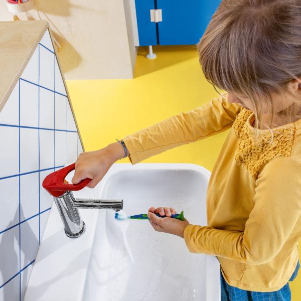 Im Mittelpunkt steht der neue Reihenwaschtisch mit Ablaufhaube, der auf einer durchgehenden Länge von 130 cm drei Bereiche in drei verschiedenen Höhen und drei Tiefen bietet. Die Armaturen sind als Sensorarmatur und als Standarmatur mit farbigem Hebel erhältlich, dessen Griff mit einer kinderfreundlichen, runden Öffnung ausgeführt ist. Dabei sorgt der Verbrühschutz für Sicherheit.