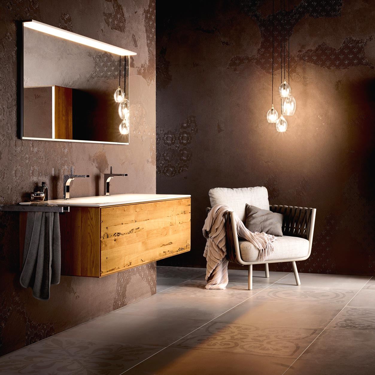 Ergänzt werden die individuell gefertigten Team 7-Badmöbeln von zum Teil speziell für diese Edition entwickelten Waschtische, Lichtspiegel, Accessoires und Armaturen des Badausstatters Keuco. Eine Besonderheit ist hier die Standarmatur, die speziell erhöht inmitten eines runden Varicor-Beckens steht.
